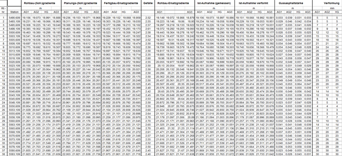 Das Berechnen der neuen Höhenlage der neuen Deckschicht für die Asphaltierungsmaschinen. Hier gilt es nach den Richtlinien der ZDV-ING zu berücksichtigen, dass die geforderten 2,5 bis 6,5 cm Ausgleichsschicht nicht über- oder unterschritten wird. Nun ist es an dem Planer die Gradientenlage so zu trassieren das die zu ermittelnden Fräs- und Ausgleichsbereiche optimiert sind.